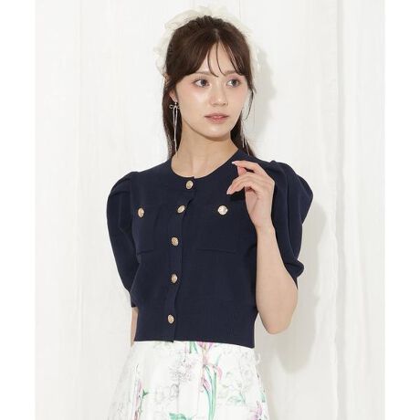 クラシカルなディテールと着回し力を兼ね備えた、パフスリーブのショート丈カーディガン【Design】・ふんわりとしたパフスリーブが可愛らしさを引き立てる、上品なショート丈カーディガン。・リブ仕立ての袖と裾がほどよくフィットし、伸縮性のある生地感で快適な着心地♪・エンブレム風のゴールドボタンが華やかなアクセントとなり、コーデにクラシックなエッセンスをプラスします。・胸元にはさりげなくポケットをあしらい、実用性とデザイン性を両立◎・羽織りとしてはもちろん、フロントボタンを閉じてトップス風に着こなすのもおすすめです♪・キャミワンピースやハイウエストボトムとの相性も抜群で、夏の着回しに活躍する一枚です。【Fabric】・伸縮性のある生地を使用。・夏にも着回ししやすい生地感です。・ご自宅でお手入れが出来るのも嬉しいポイント♪・ホワイト、ピンク、サックス、ネイビーの4色展開となります。【Care】手洗い可能