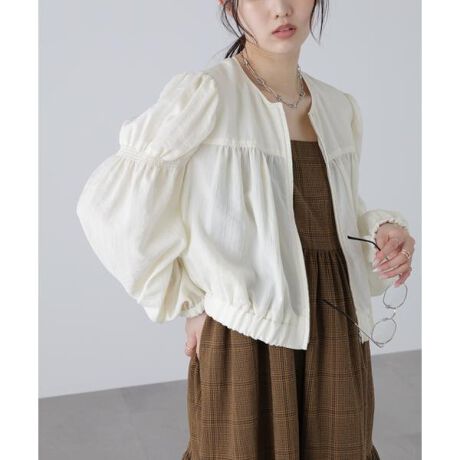 シャツ感覚で着られる薄手のブルゾンです。水洗いでくたっと柔らかくし、洗いざらしならではの、ナチュラルな風合いのコットン生地を使用。ギャザーをふんだんに入れつつも、柔らかい生地なので膨張せず、ドレープのように流れます。袖口と裾は平ゴム入りで、袖丈は長さを調節できます。シャツ地なので腰巻きや肩掛けをすると温度調整も可能。キャミワンピースやパンツとのスタイリングがおススメです。※モデルの着用画像の場合、光の当たり具合により、実際の色味と異なって見えることがございます。色味は、商品単体の画像をご参照ください。