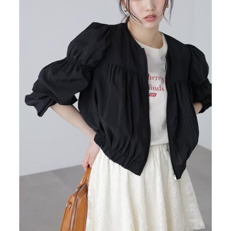 シャツ感覚で着られる薄手のブルゾンです。水洗いでくたっと柔らかくし、洗いざらしならではの、ナチュラルな風合いのコットン生地を使用。ギャザーをふんだんに入れつつも、柔らかい生地なので膨張せず、ドレープのように流れます。袖口と裾は平ゴム入りで、袖丈は長さを調節できます。シャツ地なので腰巻きや肩掛けをすると温度調整も可能。キャミワンピースやパンツとのスタイリングがおススメです。※モデルの着用画像の場合、光の当たり具合により、実際の色味と異なって見えることがございます。色味は、商品単体の画像をご参照ください。