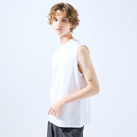 一枚でもインナーにも使える万能なノースリーブ。 ショーツやサンダルなどのスタイルからスラックスやデニムなどのモード、カジュアルにも 合わせられる一枚です。