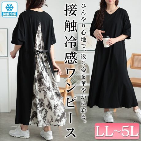 【大きいサイズ】 接触冷感後ろ花柄切り替えワンピース 大きいサイズ レディース ワンピース ロング