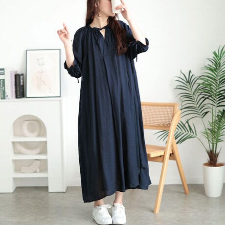 ふわり、風が通るゆったりシルエットのリボンキーネックギャザーワンピースの登場です。豊かなギャザーが作り出すたっぷりの落ち感で、ぽっこりお腹〜脚のラインまでぽっちゃりさんが気になる部分をまるっとカバーしてくれます◎ゆとりのあるラグランスリーブで肩&腕まわりノンストレスにご着用いただけます♪シンプルデザインでデイリーからお出かけまで大活躍するマストバイの一着です!