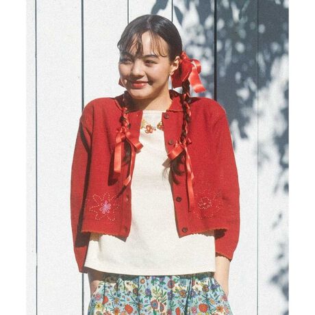 果実をイメージしたカーディガン。テーマの「赤い果実」からインスピレーションを受けています。袖と裾をやや短めにお仕立てした、締め付け感のないコンパクトなシルエットです。メッシュとドットを組み合わせたシアーな編地が軽やかな印象を与えます。襟付きで首元まで華やかなデザイン。裏側の編み地をあえて表に使った天竺裏目とハンド刺繍で入れたお花のデザインがポイントに。細部にまでこだわったカーディガンは今季イチオシのオススメアイテムです。