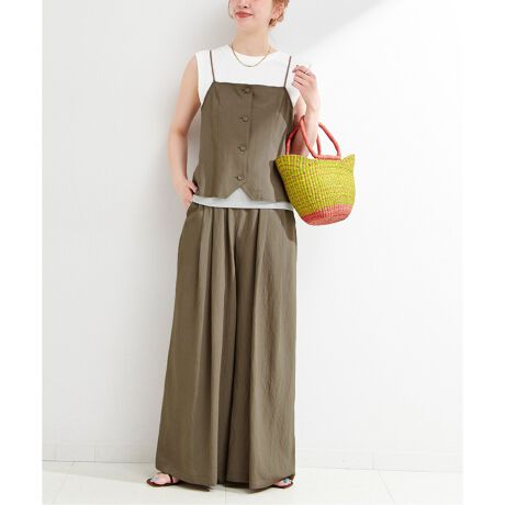 キャミソール型トップスはストラップを細めにし今年らしい見え感に、インナーのタンクトップは肩幅を広めに設定しているので上半身が品よく綺麗見えします。レーヨンナイロン素材で軽くで柔らかく、夏に向けて着用しやすい生地感になっています。