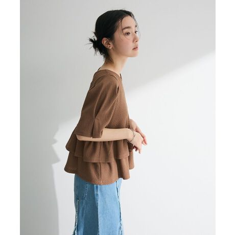 ダイヤ柄の凹凸感が目を惹く半袖プルオーバー。タックやティアードディテールを施した華やかなデザインながらも、落ち着きのあるワントーンに抑えたカラーリングで上品に仕上げました。前後どちらを前にしても着用できる2WAY仕様なのも魅力的。デニムやスラックスなどシンプルなボトムを合わせるだけでおしゃれに着用いただけるおすすめのアイテムです。透け感[なし]