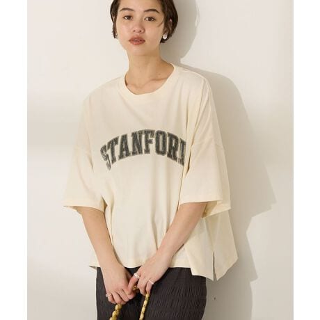 キャッチーなアーチロゴが魅力のプリントTシャツ。ドルマンシルエットとドロップショルダーデザインでゆったりと着ていただけます。体型をカバーしつつも、コンパクトな着丈がミニマルな印象に。ワイドデニム、タイトスカートなどのボトムスと好相性のアイテムです。透け感[ややあり]