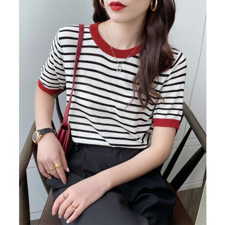 マルチボーダー×配色リブが目を惹く半袖ニットトップス。