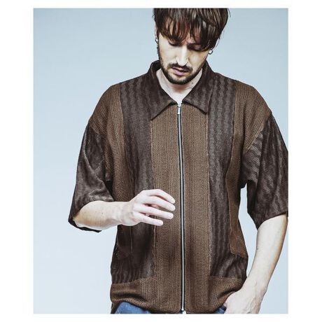 フロントファスナーを採用したアウターライクなディティール オーバーショルダーでリラックス感のあるシルエット 身頃、背面には透かし編みとラーベン編みを採用し、立体感のある表情と涼しげな印象をプラス