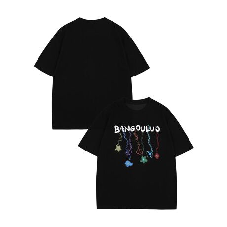 ポップな「BANGOU LUO」ロゴの下に、カラフルなフラワーチャームをあしらった個性的なTシャツ。立体感のあるデザインで遊び心があり、シンプルながらも目を引くアクセントに。オーバーサイズシルエットで、トレンド感のあるゆったりとした着こなしが楽しめる一枚。