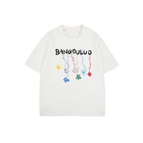 ポップな「BANGOU LUO」ロゴの下に、カラフルなフラワーチャームをあしらった個性的なTシャツ。立体感のあるデザインで遊び心があり、シンプルながらも目を引くアクセントに。オーバーサイズシルエットで、トレンド感のあるゆったりとした着こなしが楽しめる一枚。