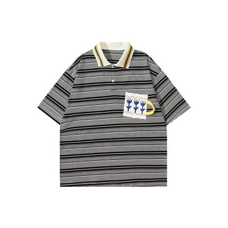 ボーダー柄と個性的なカップデザインの刺繍ポケットがポイントのポロシャツ。襟元にはトリムカラーを施し、カジュアルながらも上品なアクセントをプラス。ゆったりとしたオーバーサイズシルエットで、リラックス感のある着こなしが叶う一枚。スポーティーでトレンド感のあるデザインが魅力的。
