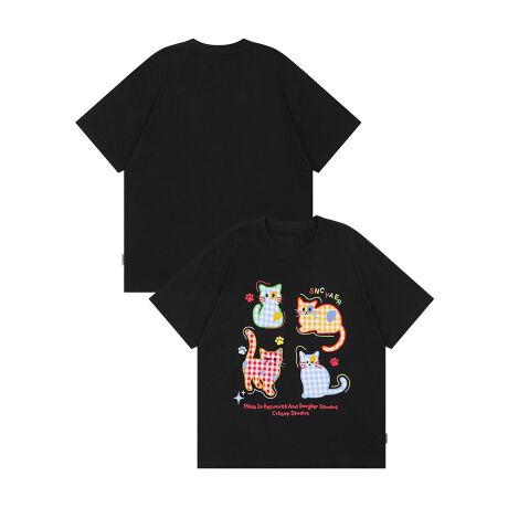 ギンガムチェック柄のカラフルな猫のプリントが可愛らしいTシャツ。遊び心のあるデザインで、カジュアルなスタイルにぴったり。程よいオーバーサイズシルエットで快適な着心地。シンプルなボトムスと合わせるだけでおしゃれに決まるアイテム。