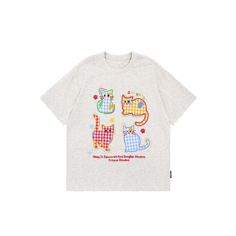 ギンガムチェック柄のカラフルな猫のプリントが可愛らしいTシャツ。遊び心のあるデザインで、カジュアルなスタイルにぴったり。程よいオーバーサイズシルエットで快適な着心地。シンプルなボトムスと合わせるだけでおしゃれに決まるアイテム。