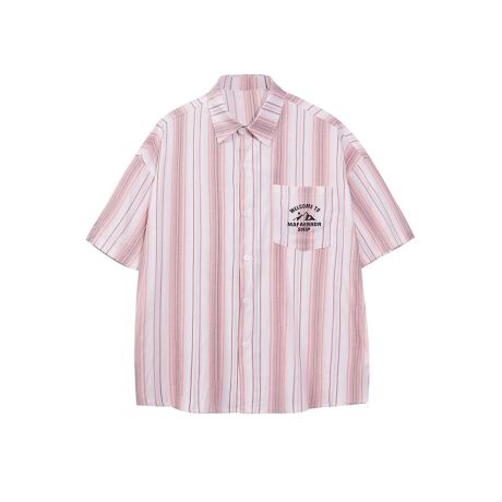 爽やかなストライプ柄が特徴の半袖シャツ。左胸には刺繍デザインが施され、シンプルながらもこなれ感のある一枚。ゆったりとしたオーバーサイズシルエットで、ボタンを開けて羽織りとしても活用でき、季節を問わず着回しやすいアイテム。