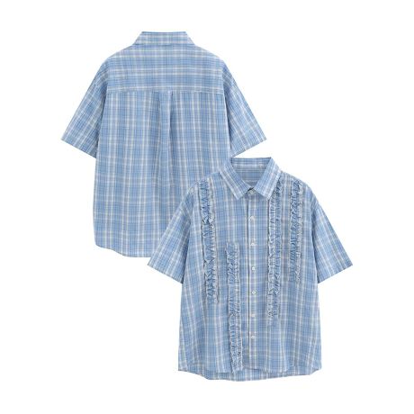 クラシックなチェック柄にフェミニンなフリルディテールをプラスした、甘辛ミックスなデザインシャツ。ゆったりとしたシルエットで、カジュアルながらも女性らしい雰囲気。ボタンを開けて羽織としても活躍し、幅広いスタイリングが楽しめる一枚。