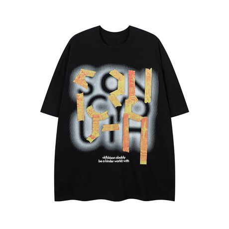 幻想的なぼかしデザインに、レタープリントが組み合わさったユニークなTシャツ。遊び心のあるテープ風プリントが立体感を出し、個性的な印象を与える一枚。オーバーサイズのシルエットで、ストリート感溢れるコーディネートに最適。