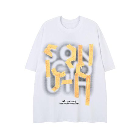 幻想的なぼかしデザインに、レタープリントが組み合わさったユニークなTシャツ。遊び心のあるテープ風プリントが立体感を出し、個性的な印象を与える一枚。オーバーサイズのシルエットで、ストリート感溢れるコーディネートに最適。