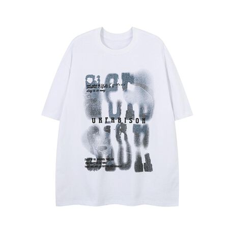 幻想的なぼかしデザインに、レタープリントが組み合わさったユニークなTシャツ。遊び心のあるテープ風プリントが立体感を出し、個性的な印象を与える一枚。オーバーサイズのシルエットで、ストリート感溢れるコーディネートに最適。