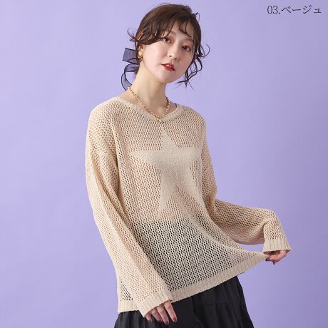 [型番:14952059]フロントのスターモチーフがポイントのメッシュニット。ゆる落ち感のあるルーズシルエットでカジュアルな雰囲気に仕上げました。カットソーなどをインしてレーヤードアレンジに最適な一枚♪季節を問わず着られる素材感でロングシーズン活躍してくれるおすすめアイテムです。