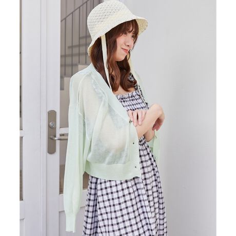 冷房対策の羽織としてや、ボタンを閉めてトレンド感あるシアートップスとしても活躍する、絶妙な透け感のニットカーディガンです。