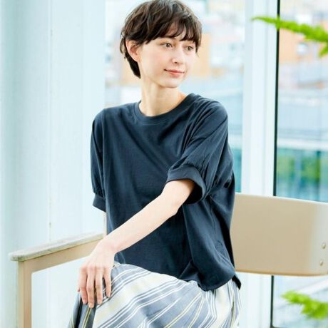 やや長めの半袖は二の腕カバーもでき、袖ディティールが着映えするデザインです。