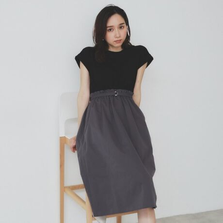・布帛のタックフレアのスカート部分はウエストにゴールドがポイントのサッシュベルトを使い、メリハリのあるシルエットを実現。