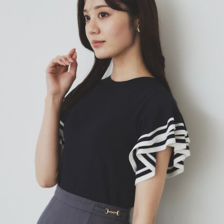 ボーダーフリルスリーブが印象的なデザインニット