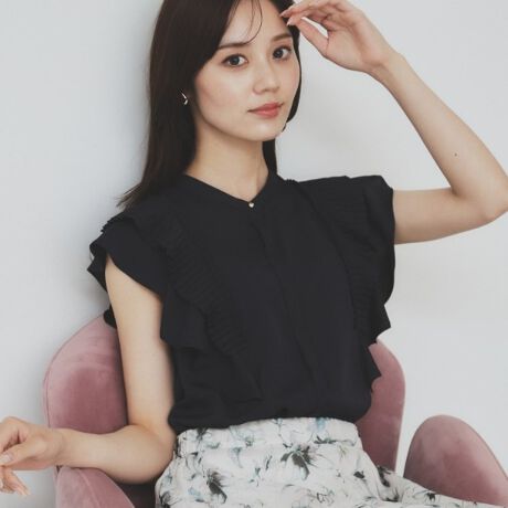 ・プリーツとフレアのレイヤードフリルが上品で、フェミニンな印象のデザインブラウス。