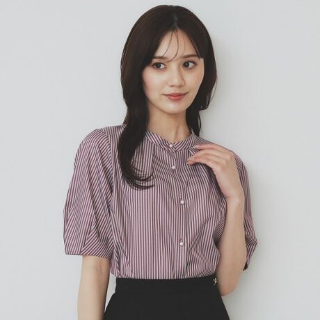 ・ランダムストライプのスタンドカラー五分袖ブラウスで、トレンド感のある一枚。