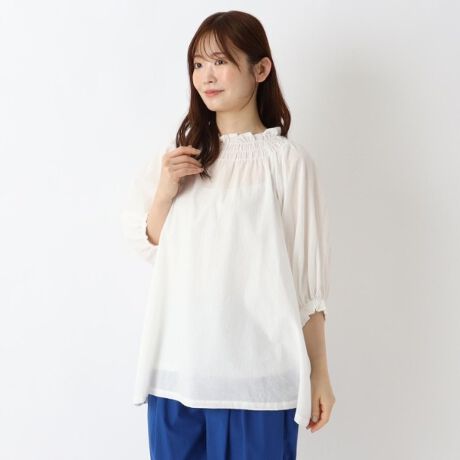 ネックラインと袖口のシャーリングが可愛い布帛プルオーバー。
