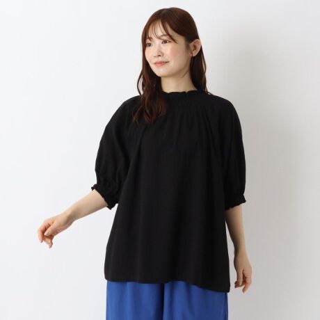 ネックラインと袖口のシャーリングが可愛い布帛プルオーバー。