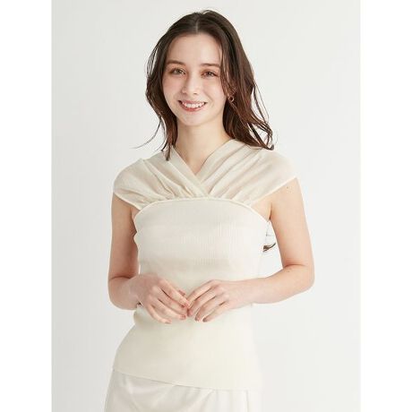 肩まわりをシアーに編みタックを入れており、前と後ろで表情の異なる前後着用可能な2WAYアイテム。