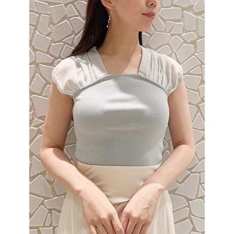 肩まわりをシアーに編みタックを入れており、前と後ろで表情の異なる前後着用可能な2WAYアイテム。