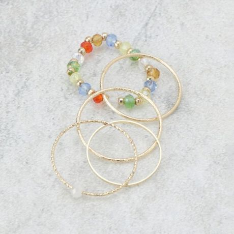 5つのリングを全て同じ指につけたり、変則的につけたりと様々な楽しみ方ができるリング。