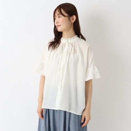 襟ぐりと袖口のフリルが可愛いブラウス。