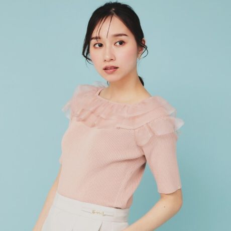 すっきりとしたスクエアネックにシアーフリルがレイヤードされたデザインニット