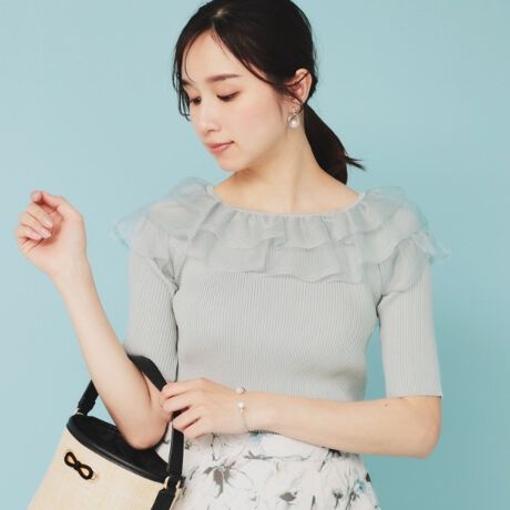 すっきりとしたスクエアネックにシアーフリルがレイヤードされたデザインニット
