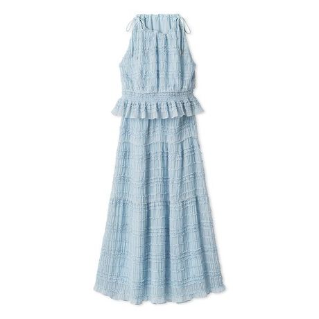 短くカットされたシフォンがランダムに配置されたギャザー生地でアメスリカットのトップスとスカートのセットアップです。