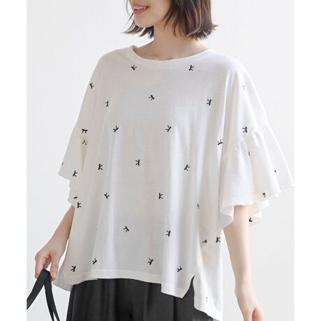 女性らしいフレアスリーブで腕の華奢見えも叶えてくれます。