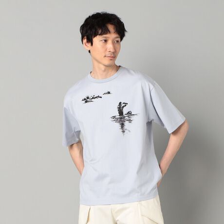 Tシャツにモノトーンで描かれたサーフガールのグラフィックが、バンクシーを思わせる、海と空の広がりを感じさせるアートピースです。