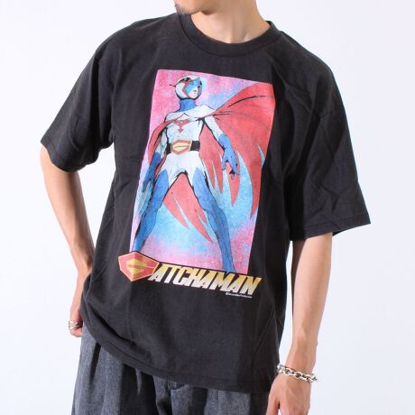 昭和の名作アニメ「スピードレーサー」「ガッチャマン」「マジンガーZ」など、当時のヒーローたちを大胆にプリントした1枚。