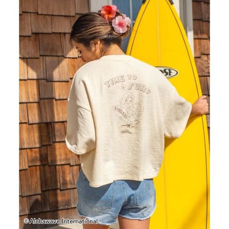 【Kahiko×Aloha Mapua】サーフィンとファッションをこよなく愛する、プラチナブロンドのロコガール・マプアとのコラボのショート丈Tシャツ。胸元にはロゴ、後身頃にはレトロな雰囲気のグラフィックがプリントされています。