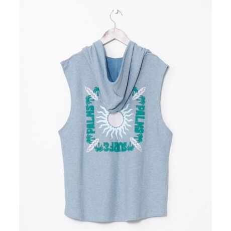 肌触りの良いカットソー素材のフード付きメンズタンクトップ。メキシカンパーカー風のデザイン。水着の上などにさらっと着るのに便利で、後ろのプリントがポイント。フード裏はパイル素材になっています。
