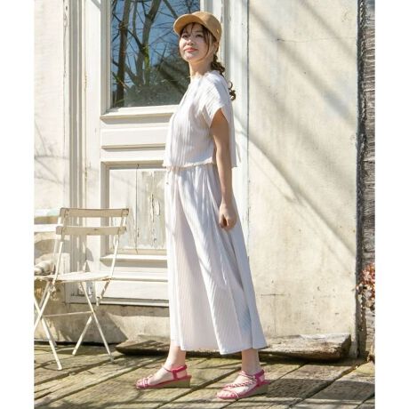 [型番:LCA-5202-2025]透け感のある生地が上品な印象のトップスとワンピースのセットアップ。ロング丈のワンピースはウエストにゴムが使用されており、程よくフィット。紐で縛ればスマートに。裏地も付いて安心。両サイドにはポケットも付いています。トップスは首周りや裾に入ったさり気ないカラーがおしゃれ。短めの丈で足長効果も。単品でも着回しが出来、コーディネート次第でオールシーズン着られます。