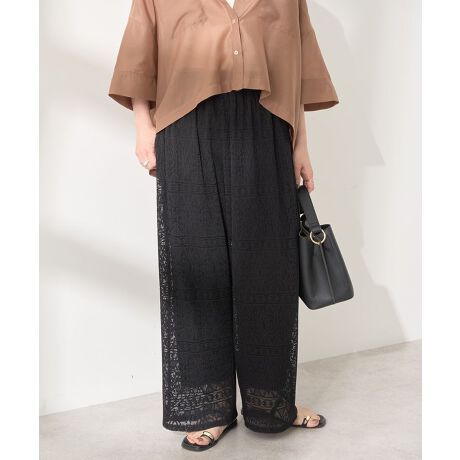 レイヤードスタイルにぴったりなヘルシーな透け感を魅せるレース仕立てのデザインパンツ。細畝のプリーツ加工にオリエンタルなモチーフ柄がカジュアルスタイルにぴったりのひと品です。リラクシーな総ゴムウエストで楽に着脱も可能。裏地付きの安心仕様でリラクシーな穿き心地ながら、スタイルアップ効果にも期待出来る細見えアイテムです。透け感[あり]