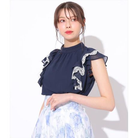 【ほど良い甘さで大人フェミニンに仕立てる、シフォン×レースフリルスリーブブラウス】【Point】・レースを挟んだ袖フリルが大人フェミニンに仕立てる、フレンチスリーブシフォンブラウス。・プチハイネックでクラシカルに。フロントのギャザータックがさりげない甘さをプラスします。・肩先にかかるフレンチスリーブで上品に。気になる二の腕も立体的なフリルがさりげなくカバーしてくれます。・身頃部分には滑らかな肌触りで着心地の良いカットソー生地の裏地を付けており、インナーの透けを軽減してくれるので、一枚でも安心して着用いただけます。ケア方法:手洗い可能透け感:あり裏地:あり伸縮性:なし光沢感:なし生地の厚さ:薄手