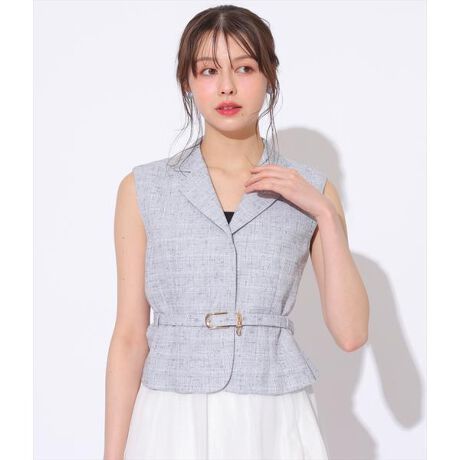 【サマーツイードが爽やかなエレガンススタイルを作り出すコンパクトショートジレ】【Point】・トップス感覚で着られるコンパクトジレが、ほんのりモードなキレイめスタイルを完成させます。・軽やかなサマーツイードを選定しており、きちんと感がありながらも夏らしい清涼感を感じられます。・女性らしいくびれラインを強調し、ウエスト位置を高く見せるペプラムシルエット。・ゴールドのベルトバックルやサルカンに付けたチャームが女性らしく上品な印象に仕立てます。ケア方法:ドライクリーニング透け感:なし裏地:あり伸縮性:なし光沢感:なし生地の厚さ:中肉