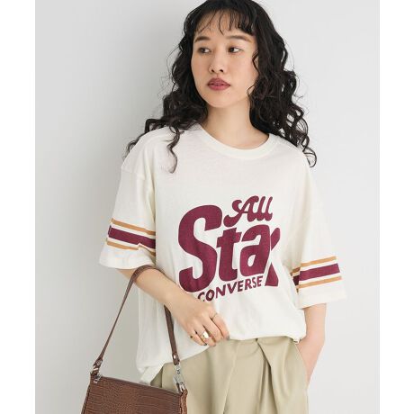 フロントのグラフィックロゴと袖のラインがポイントのCONVERSEフットボールTシャツ。