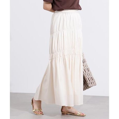 ギャザーディテールが目を引くティアードスカート。軽くて着心地が良く、動くたびにふんわりと広がるシルエットです。後ろウエストはゴム仕様でラクに着ていただけます。Tシャツやサマーニットを合わせ、抜け感のあるサンダルをはくと軽やかなコーディネートが楽しめます。<素材>軽いタフタ素材を使用しています。<詳細>仕様・後ろファスナー裏地・あり透け感・なし / 光沢・なし / 伸縮性・なし生地の厚さ・普通※モデルの着用画像の場合、光の当たり具合により、実際の色味と異なって見えることがございます。色味は、商品単体の画像をご参照ください。