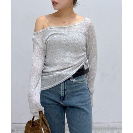 メランジ調のニットソー素材のデザイントップス。メランジカラーでカジュアルな雰囲気を演出し、シンプルながらもアクセントになるカットソーです。裾はアシンメトリーヘムデザインで、左脇は共地リボンで絞れるドロスト仕様。首は広めで抜け感があるのでカットソー同士のレイヤードや、ジャケットやカーディガンのインナーとしてもバランスよく着られます。ポイントはアシメヘムなので、シンプルにデニムパンツを合わせるだけでもスタイリングが決まります。※モデルの着用画像の場合、光の当たり具合により、実際の色味と異なって見えることがございます。色味は、商品単体の画像をご参照ください。